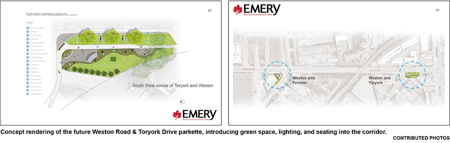 WESTON ROAD & TORYORK PARKETTEOne of the most anticipated projects is the proposed parkette at Weston Road and Toryork Drive. Designed as a welcoming gateway into Emery Village, the space will feature landscaped greenery, decorative lighting, seating, and pedestrian-friendly design elements.